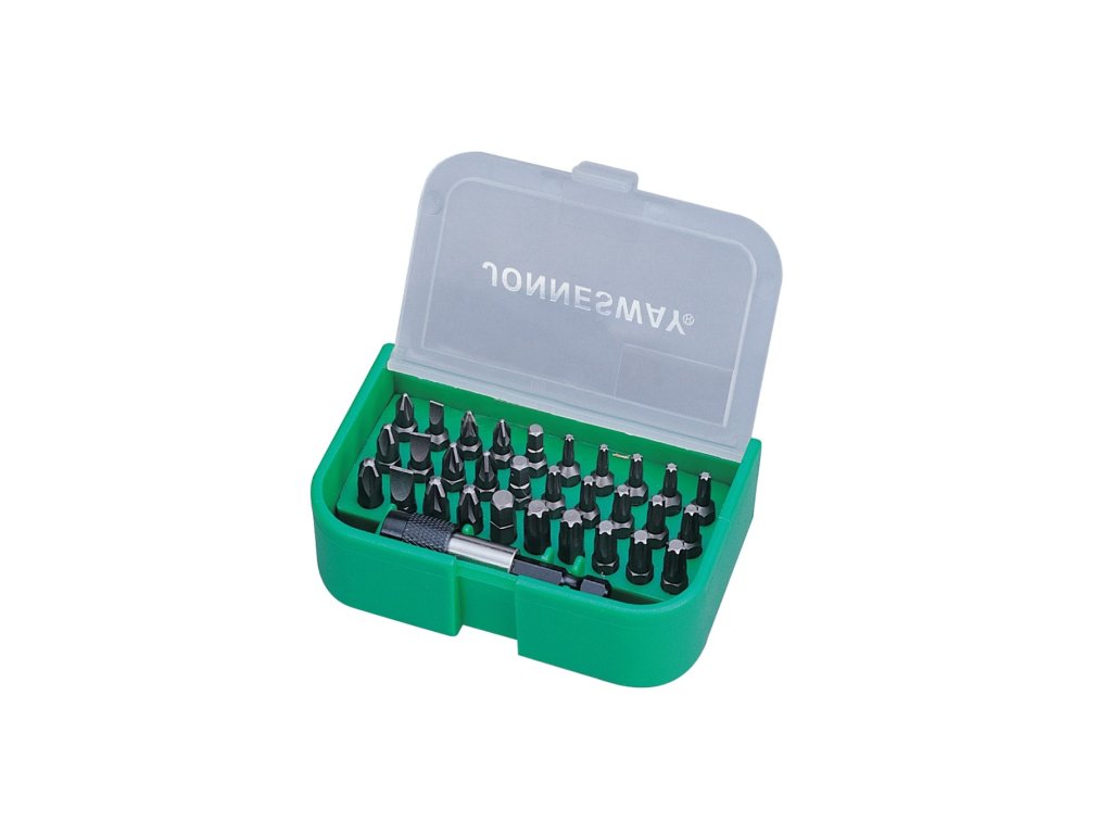 Kompaktní sada nejpoužívanějších bitů (ploché, křížové, imbus, torx), s držákem s aretací, v praktické krabičce, 31 dílů v sadě – JONNESWAY DBT31B.