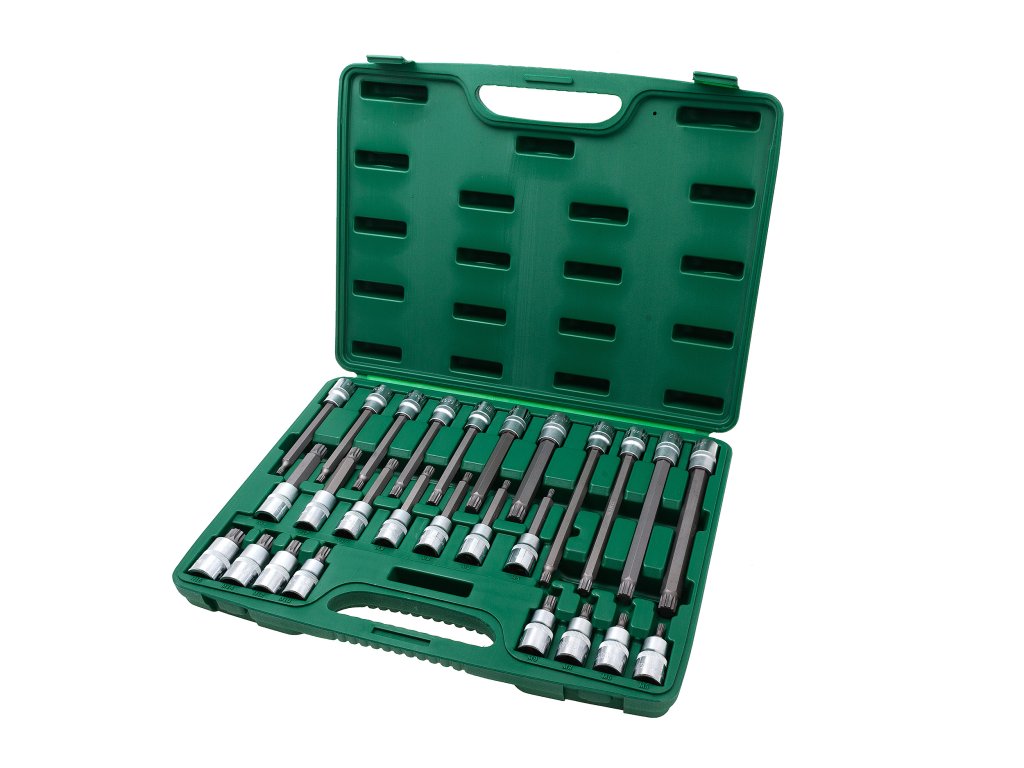 Praktická sada zástrčných hlavic typu XZN („trojitý čtverec“) s dříky různých délek (55-200 mm). Nepostradatelná výbava každého, kdo pracuje na německých vozech.