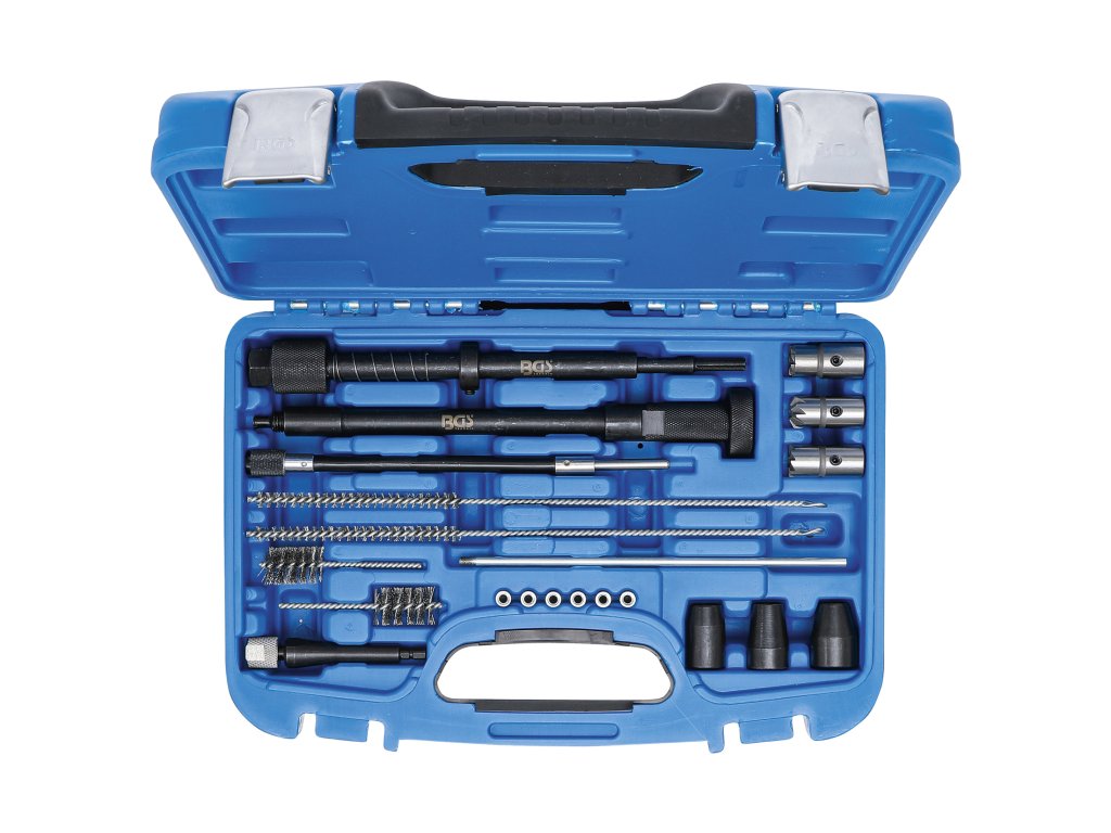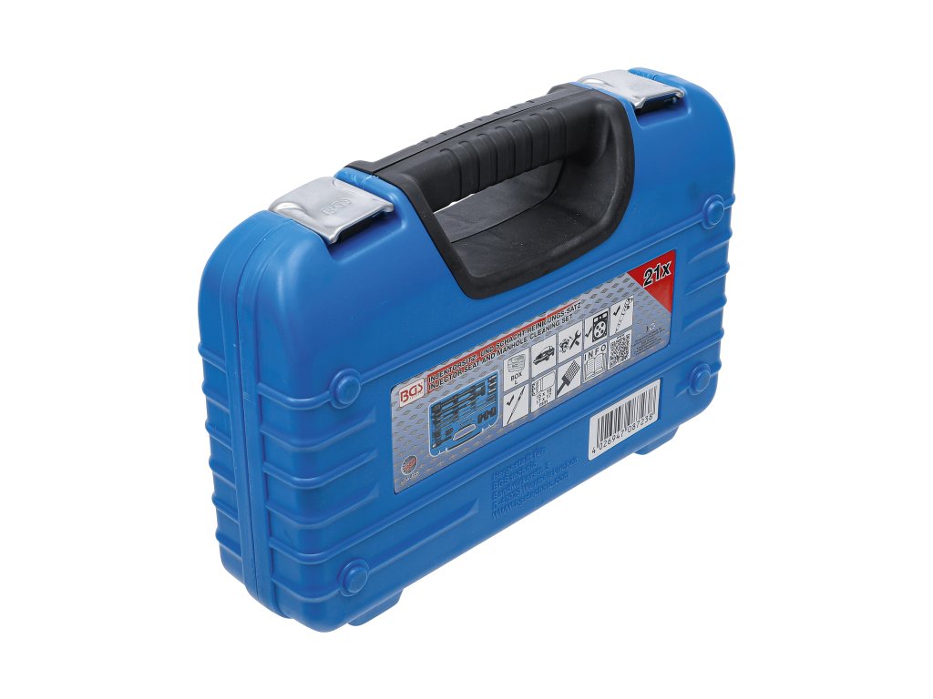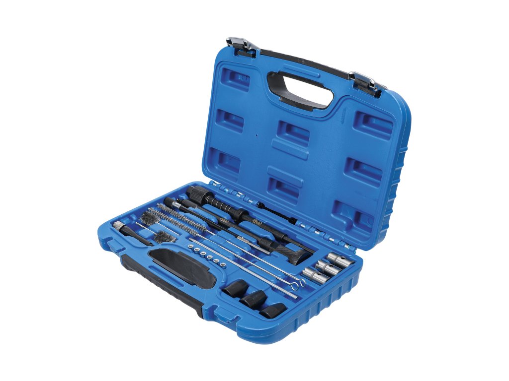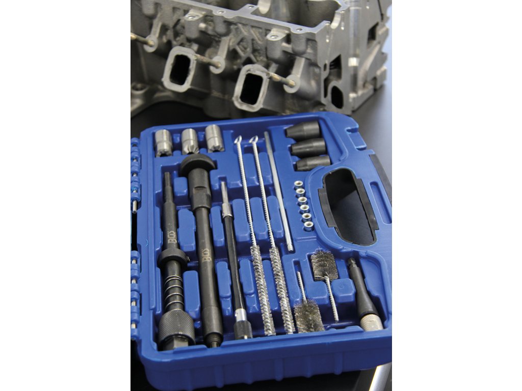 Praktická sada obsahuje vše potřebné pro čištění šachet a úpravu sedel vstřikovačů.