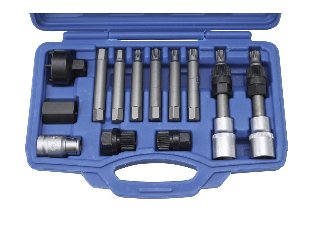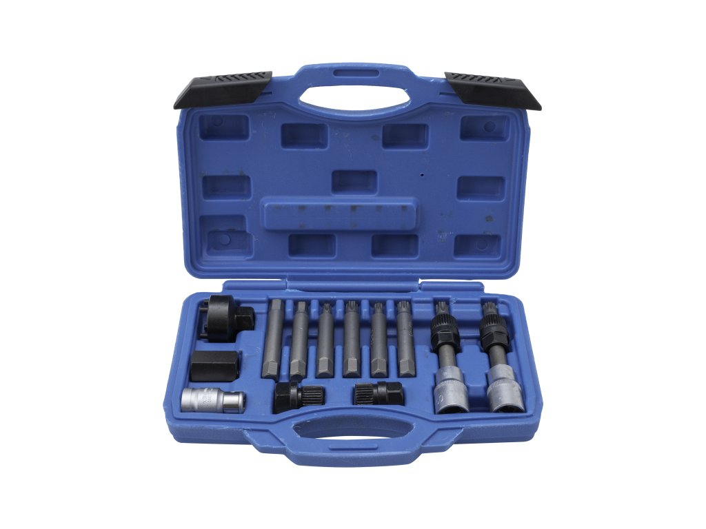 - celkem 13 různých bitů, klíčů, nástavců, hlavic a adaptérů pro servis alternátorů