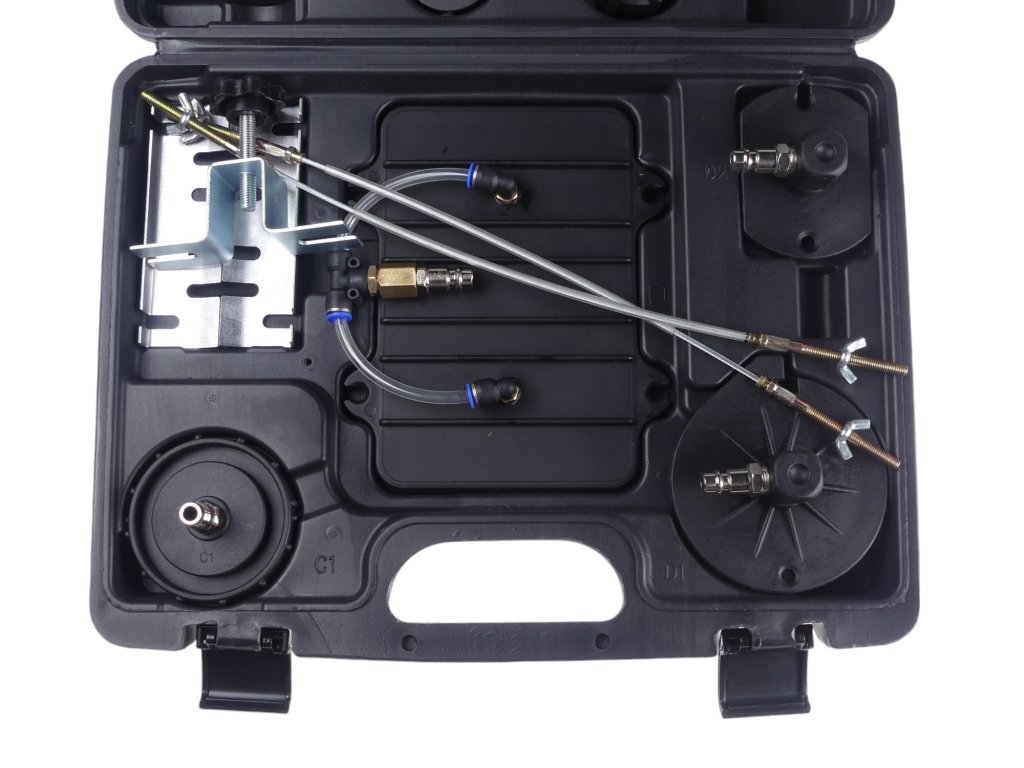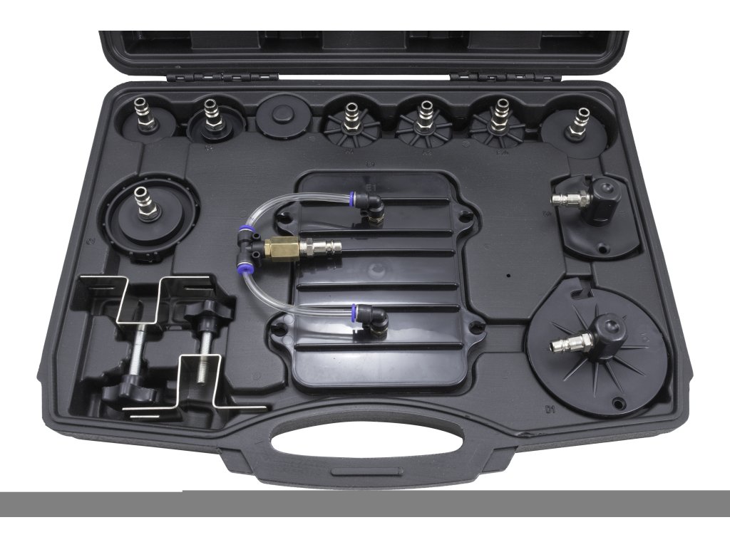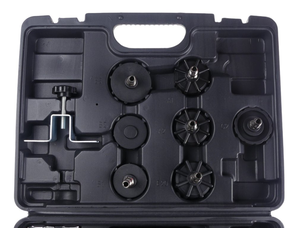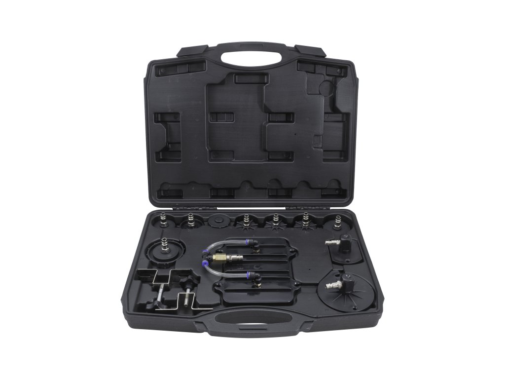 • plastový kufřík s adaptéry pro připojení plnící lahve na hrdlo nádržky s brzdovou kapalinou, 11 ks (speciální a univerzální redukce)