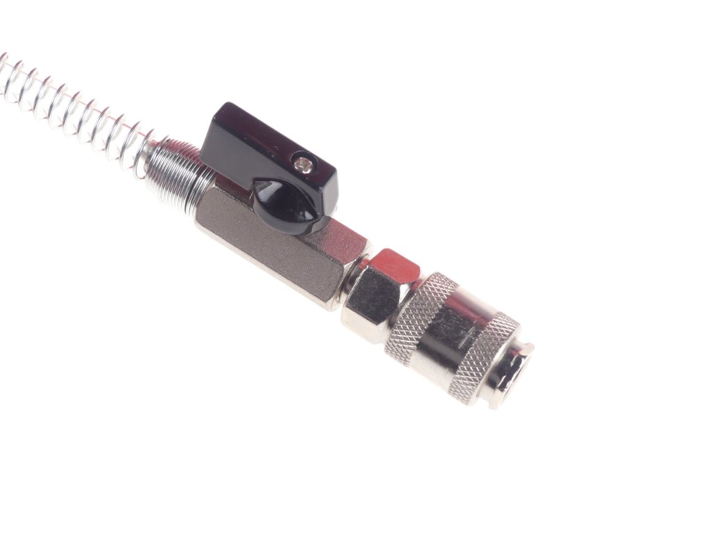 Plnící hadice je spirálovitá a vybavena kulovým ventilem a rychlospojkou.