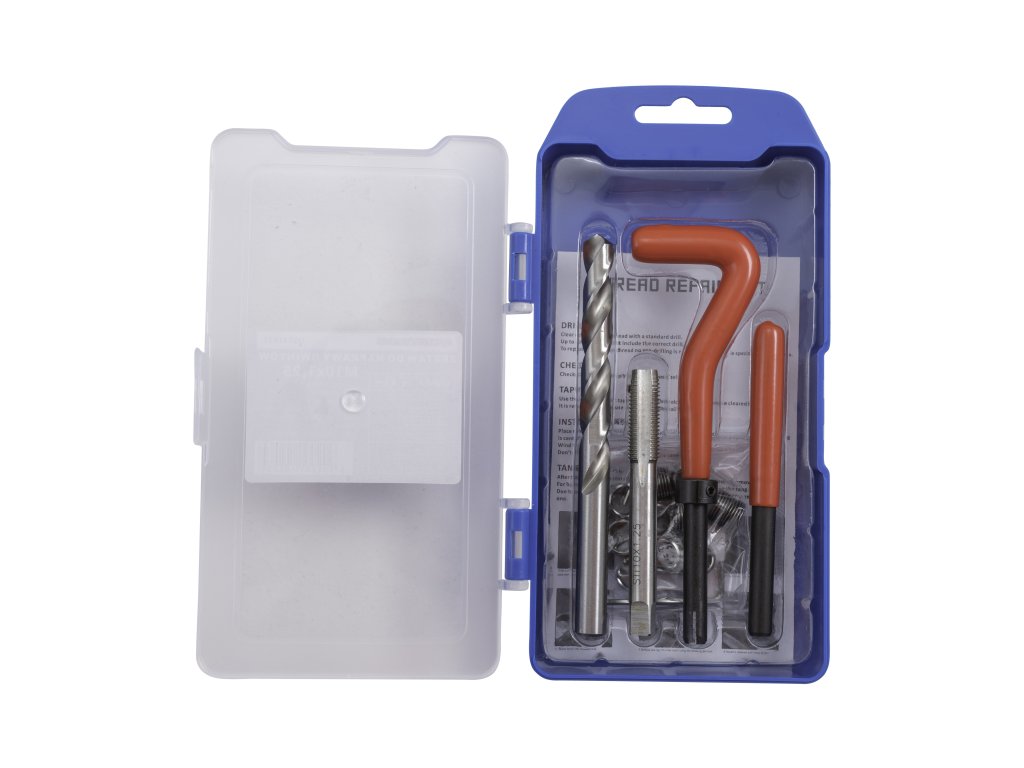 Součástí sady je vrták, závitník, vyrážeč, šroubovák a 10 ks závitových vložek. Vrták a závitník je vyroben z kvalitní oceli HSS 4341. Sada je dodávána v praktickém plastovém obalu.