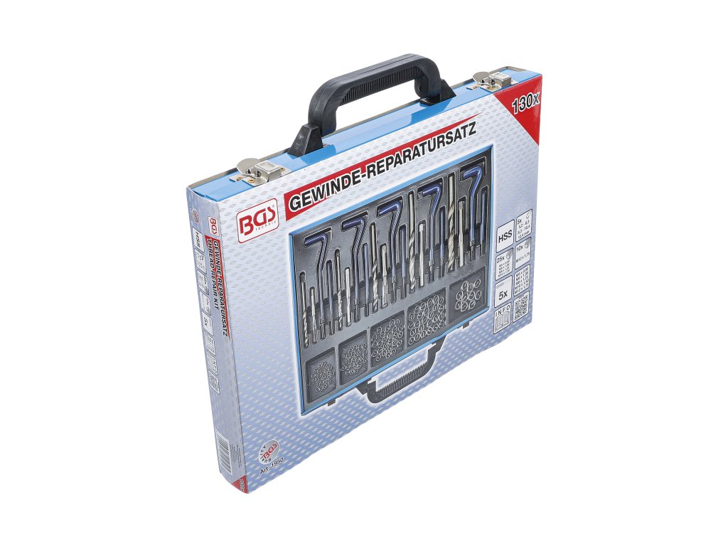 Sada na opravu závitů, včetně vložek, rozměry M5x0,80, M6x1,00, M8x1,25, M10x1,50, M12x1,75, v kovovém kufru s přezkami, 130 ks – BGS technic 1950.