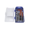 Součástí sady je vrták, závitník, vyrážeč, šroubovák a 10 ks závitových vložek. Vrták a závitník je vyroben z kvalitní oceli HSS 4341. Sada je dodávána v praktickém plastovém obalu.