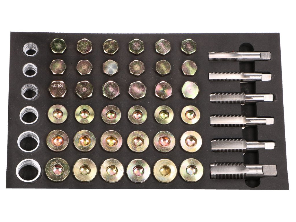 Sada obsahuje závitníky, šrouby a podložky ve velikostech M13-M22 z odolné HSS oceli, které jsou vhodné pro většinu aut nejen při opravě poškozených závitů olejových van, ale také výpustných a kontrolních šroubů převodovek a diferenciálů. Pomocí závitníku jednoduše vyříznete o 1 mm větší závit a našroubujete příslušný šroub.
