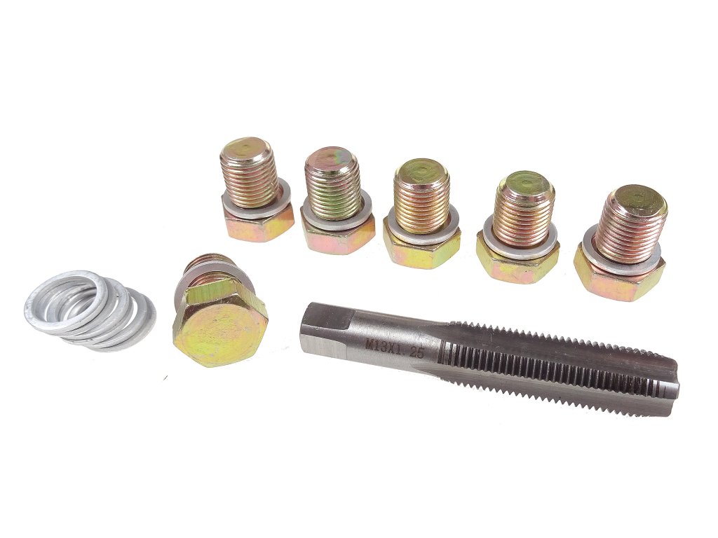 Tato sada s M13×1,25 mm závitníkem je tedy vhodná pro olejové vany, ve kterých byl původně závit M12×1,25 mm. Součástí sady je také šest šroubů se závitem M13 (vel. 17 mm) a 12 ks těsnících podložek.
