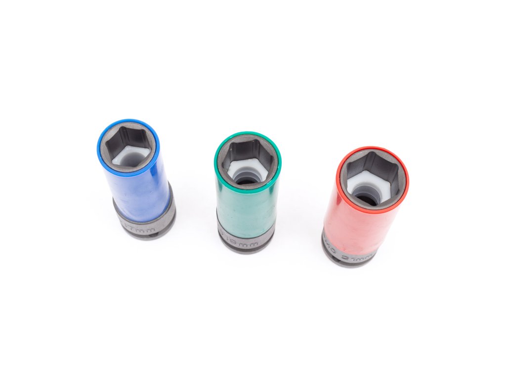 POZOR: Není určeno na přetažené, zarezlé, zatuhlé a jinak problematické šrouby! Tyto hlavice jsou kvůli barevným ochranným návlekům o něco tenčí, než běžné „plnotučné“ rázové hlavice, a na přetažených nebo zarezlých šroubech by mohlo dojít k jejich poškození.