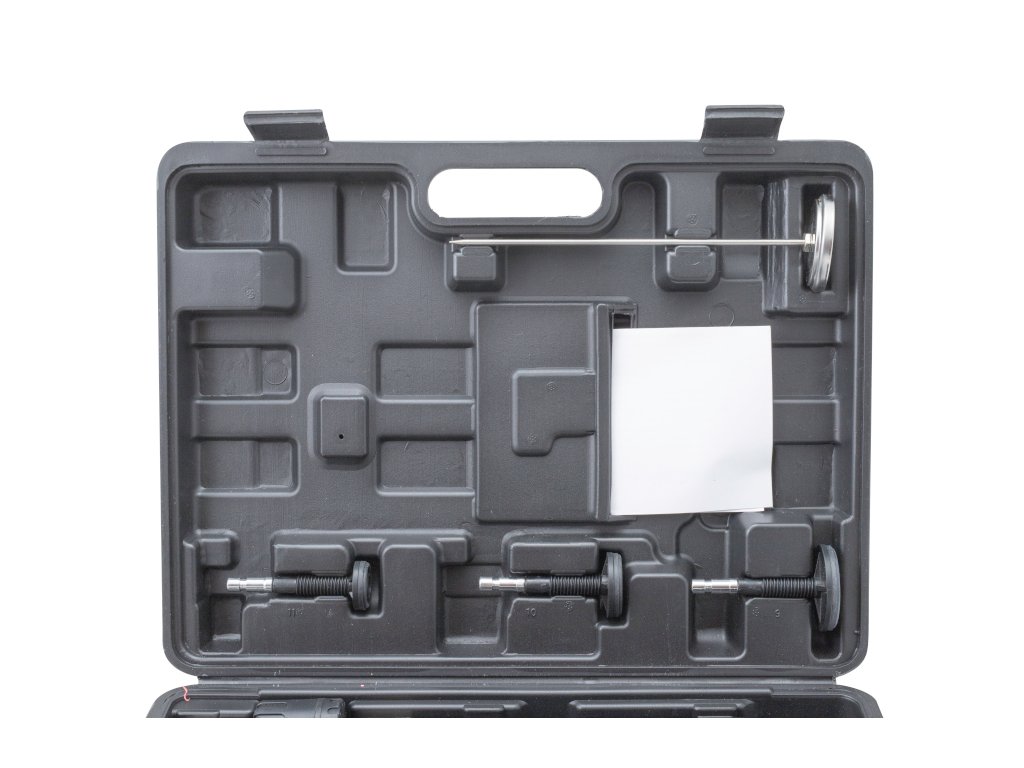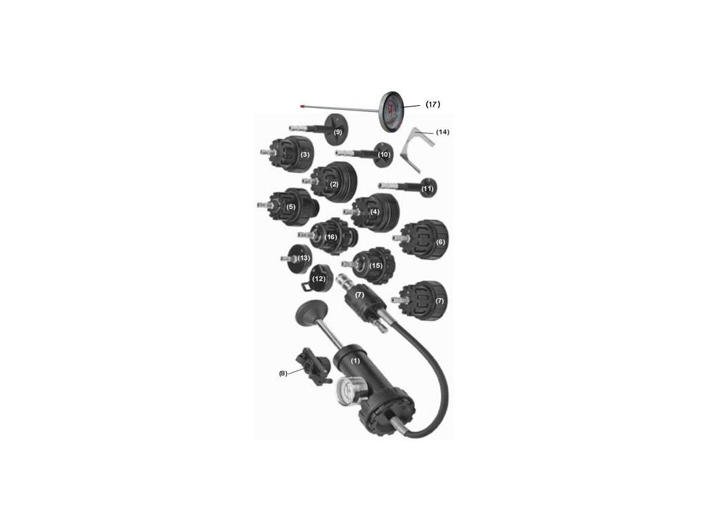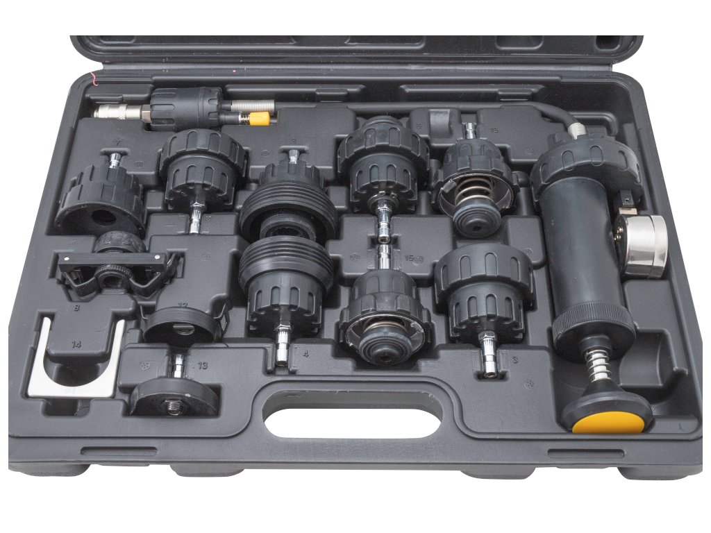 Nástroj je určen k rychlé kontrole těsnosti chladícího systému automobilů. Sada obsahuje nástavce a adaptéry pro mnoho různých značek automobilů.