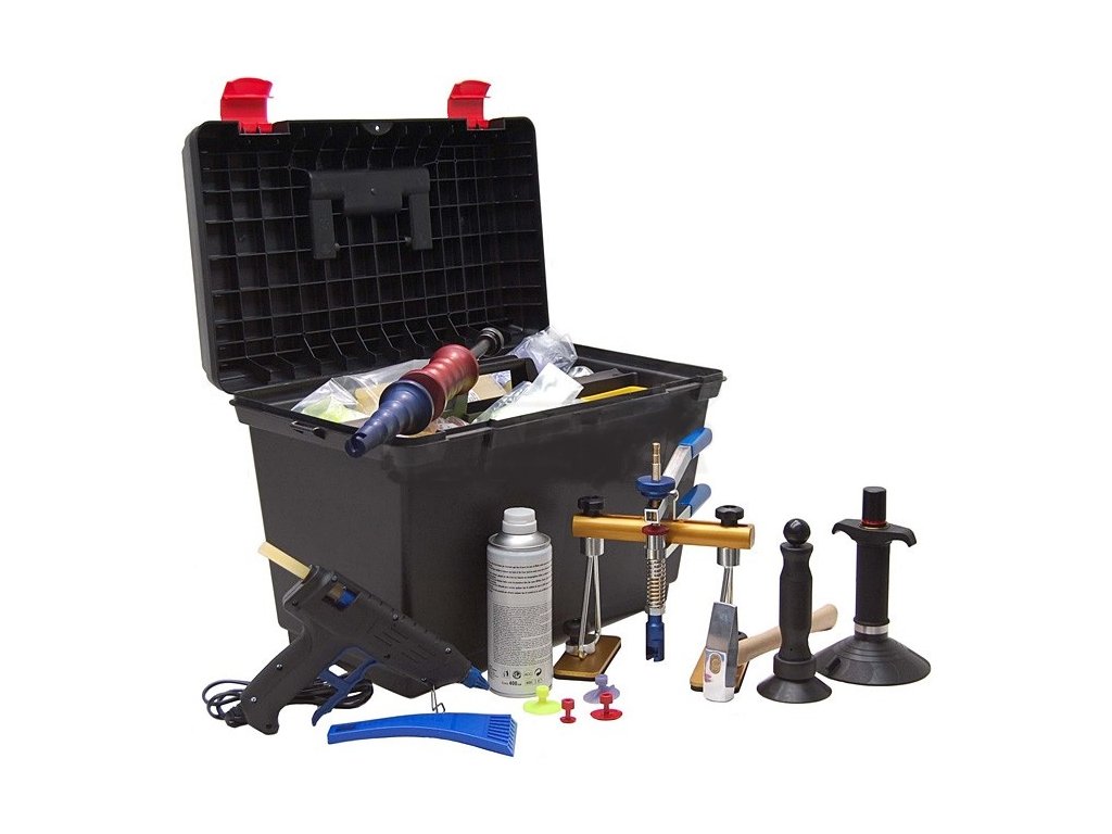 Přípravky a spotřební materiál pro opravy metodou PDR (Paintless Dent Repair), velká sada 50 dílů v plastovém kufru – MWM 31330