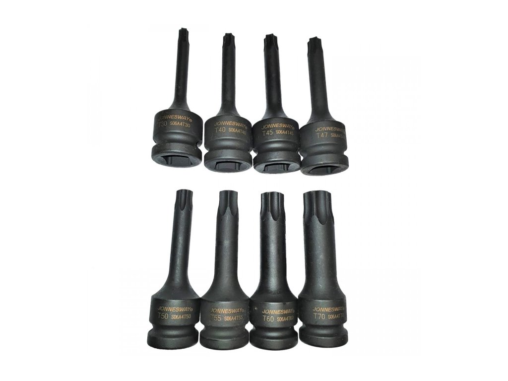 Robustní sada průmyslových zástrčných TORX hlavic značky JONNESWAY je určená pro rázové utahováky elektrické, akumulátorové i pneumatické.