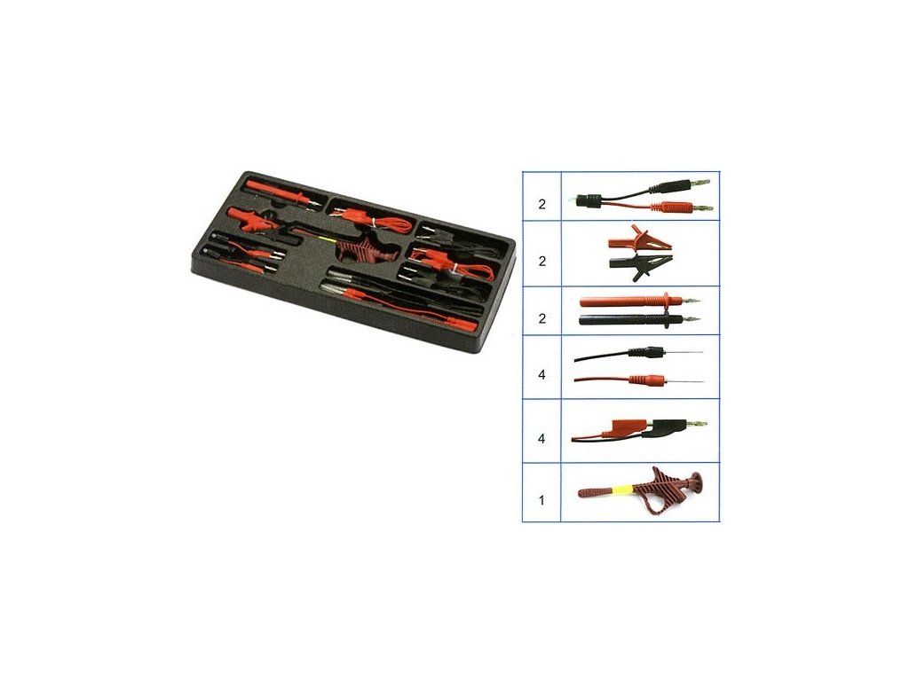 15-dílná sada testovacích kabelů a konektorů přehledně uspořádaných na plastovém platu je výborným a v mnoha případech nezbytným doplňkem většiny standardních multimetrů, ale zejména automobilových multimetrů a osciloskopů. Měření je s pomocí v sadě obsažených kabelů/konektorů rychlejší a snadnější je připojování testovacích přístrojů.