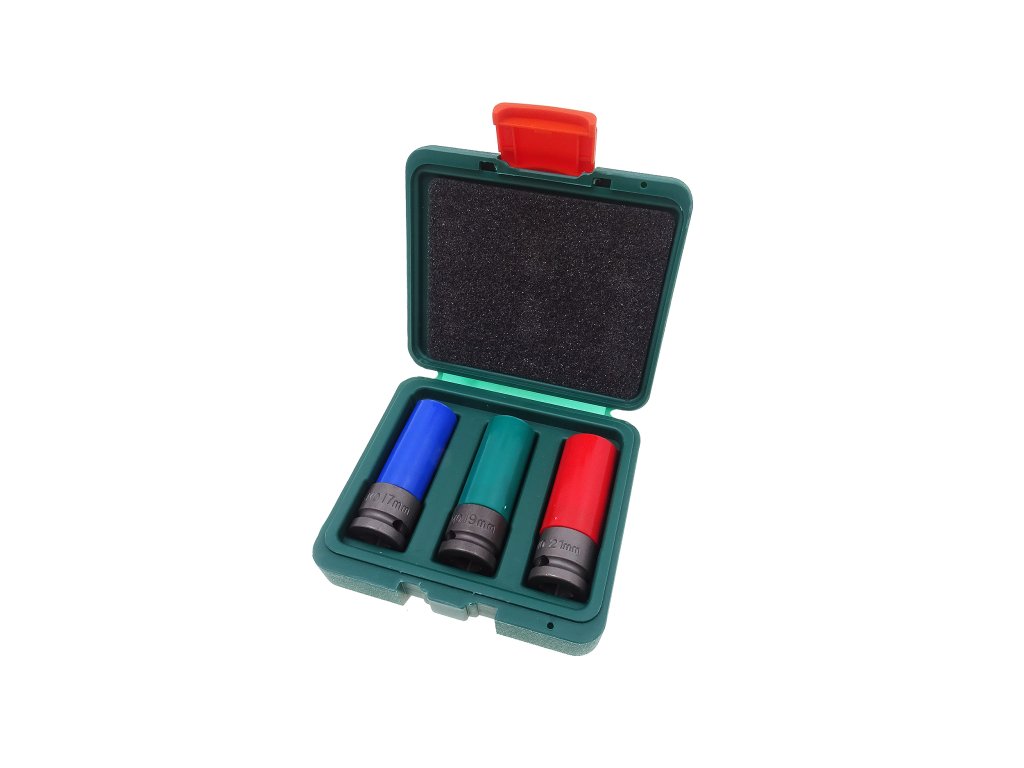 Praktická sada tří ořechů na povolování šroubů kol na autě v nejběžnějších velikostech 17, 19 a 21 mm.