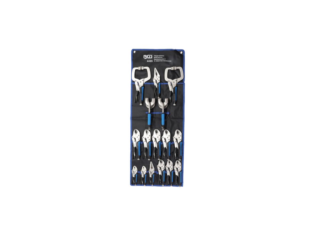 Rychloupínací kleště se samosvorným mechanismem, tzv. grip kleště, různé profily čelistí, sada 16 kusů v látkovém obalu s očky na zavěšení – BGS technic 4495