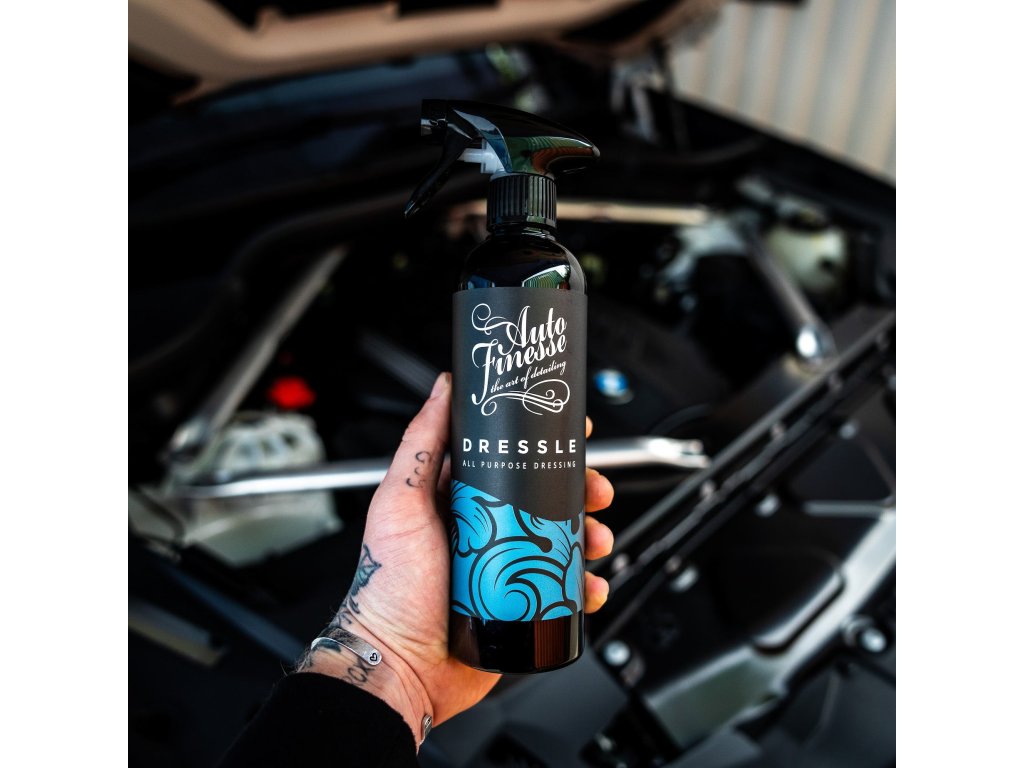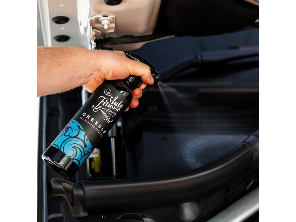 Auto Finesse Dressle je všestranný ošetřující přípravek na plastové části interiéru i exteriéru vozidla, který by neměl chybět žádnému pečlivému majiteli auta. Tento vodní přípravek s rychlým zaschnutím lze nastříkat přímo na povrch nebo aplikovat pomocí aplikátoru či hadříku v závislosti na ošetřované části a vaších preferencím. Díky svému snadnému použití ve formě spreje je Dressle ideální pro těžko dostupná místa, jako jsou podběhy kol a motorový prostor. Stačí jednoduše povrch několikrát jemně orosit a nechat zaschnout.
