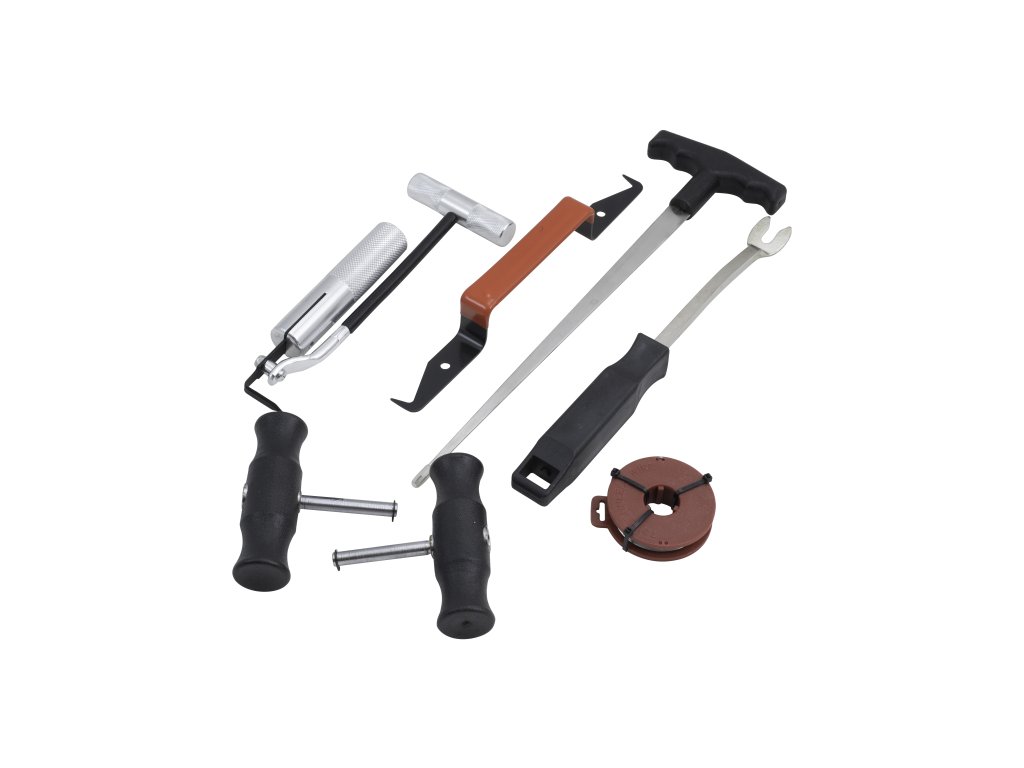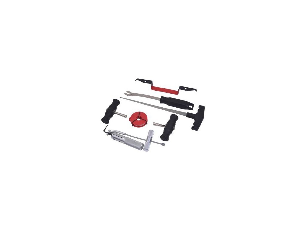 Sada speciálního nářadí na ruční vyřezání (demontáž) čelního skla přilepeného lepidlem. Obsahuje vše potřebné k demontáží interiérového obložení, protažení řezací struny, úchyty na strunu pro samotné řezání, a nůž k následnému dočištění zbytků těsnění.