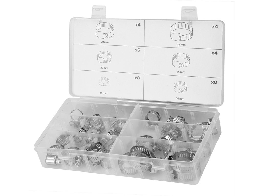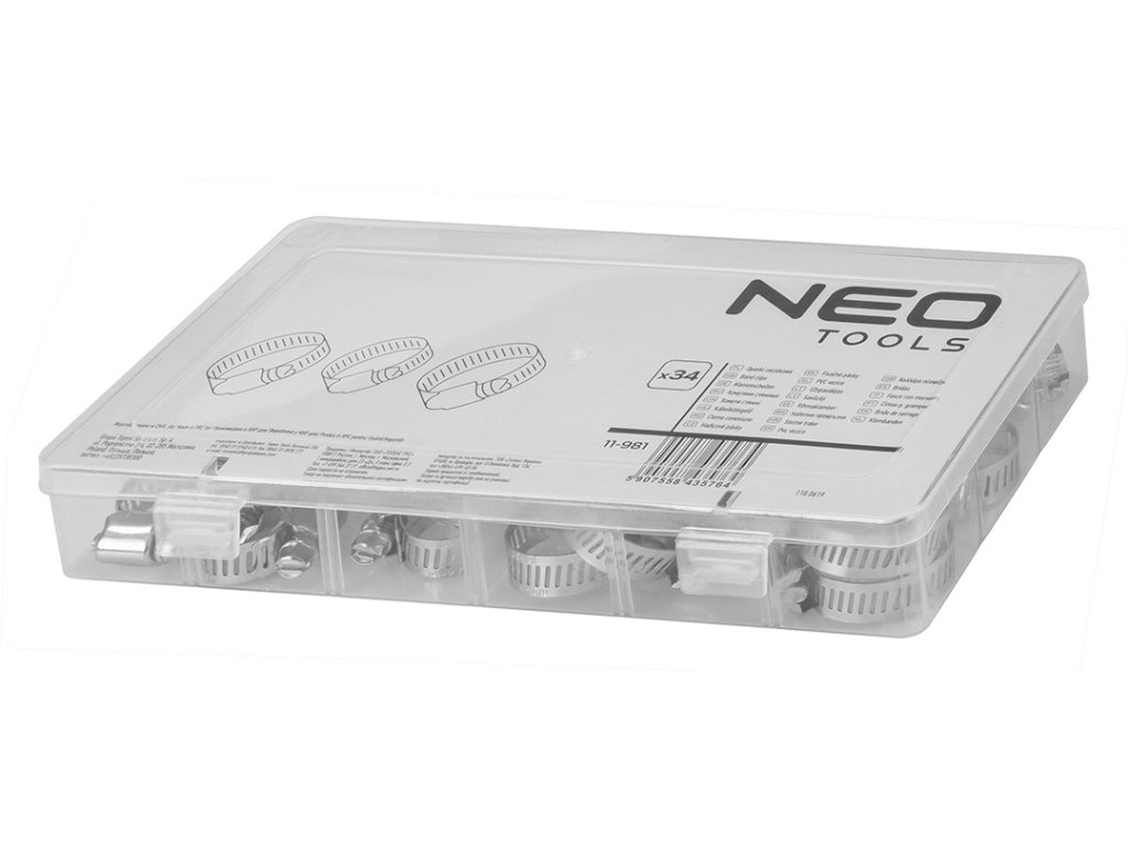 Spony na hadice, 16-32 mm, sada 34 ks, v plastové krabičce - NEO tools 11-981.