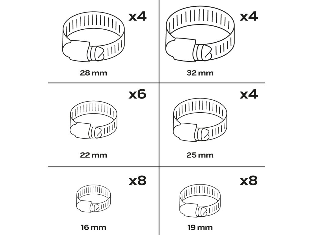 Sada spon na hadice je určena k upevnění hadic na různé typy přípojek, jako jsou trubky, koncovky a armatury. Jsou navrženy tak, aby zajistily pevné a bezpečné spojení, které zabraňuje únikům tekutin nebo plynů a zajišťuje stabilitu hadice i při vysokém tlaku.