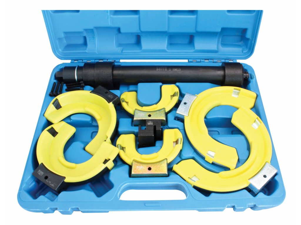 Přípravek – stahovák na montáž a demontáž pružin McPherson, průměr 80-190 mm, plastová ochrana čelistí, sada v kufru – SATRA S-BMS3.
