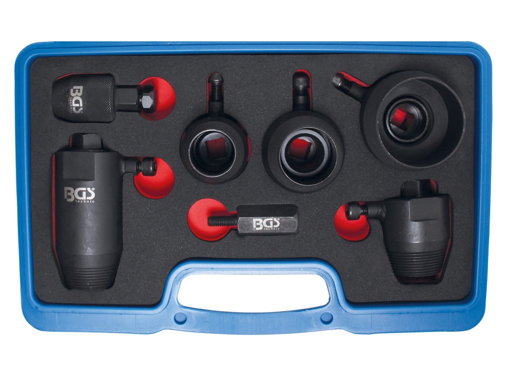 Přípravek na demontáž radiálního těsnění klikových a vačkových hřídelí benzínových motorů VAG, sada 7 dílů v plastovém kufru s pěnovou výložkou – BGS technic 9280