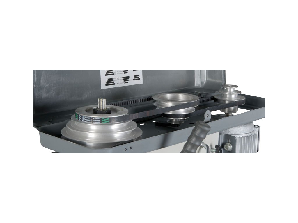 Stolní vrtačka s řemenovým pohonem a digitálním ukazatelem otáček a vrtací hloubky na vrtací hlavě.
