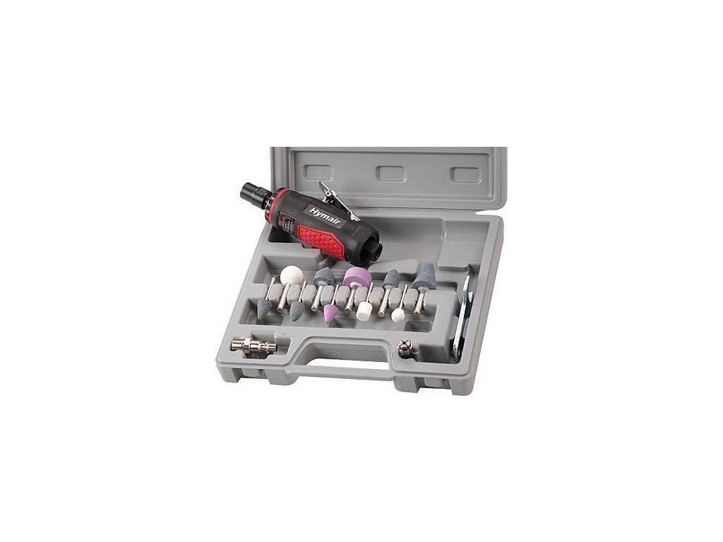 Sada v plastovém kufříku obsahuje malou stopkovou pneumatickou brusku Hymair AT-7032B, kleštinu pro upínání dříků o průměru 3 mm, 5 brousků s dříkem 6 mm, 5 brousků s dříkem 3 mm, instalační klíč a rychlospojku, údaje k brusce: upínání 6 mm, lehká aluminiová skříň, vestavěný regulátor rychlosti, pojistná páčka proti nežádoucímu spuštění, 25 000 min-1, spotřeba vzduchu 99 l/min, hadice Js 8 mm, provozní tlak 6,3 bar.