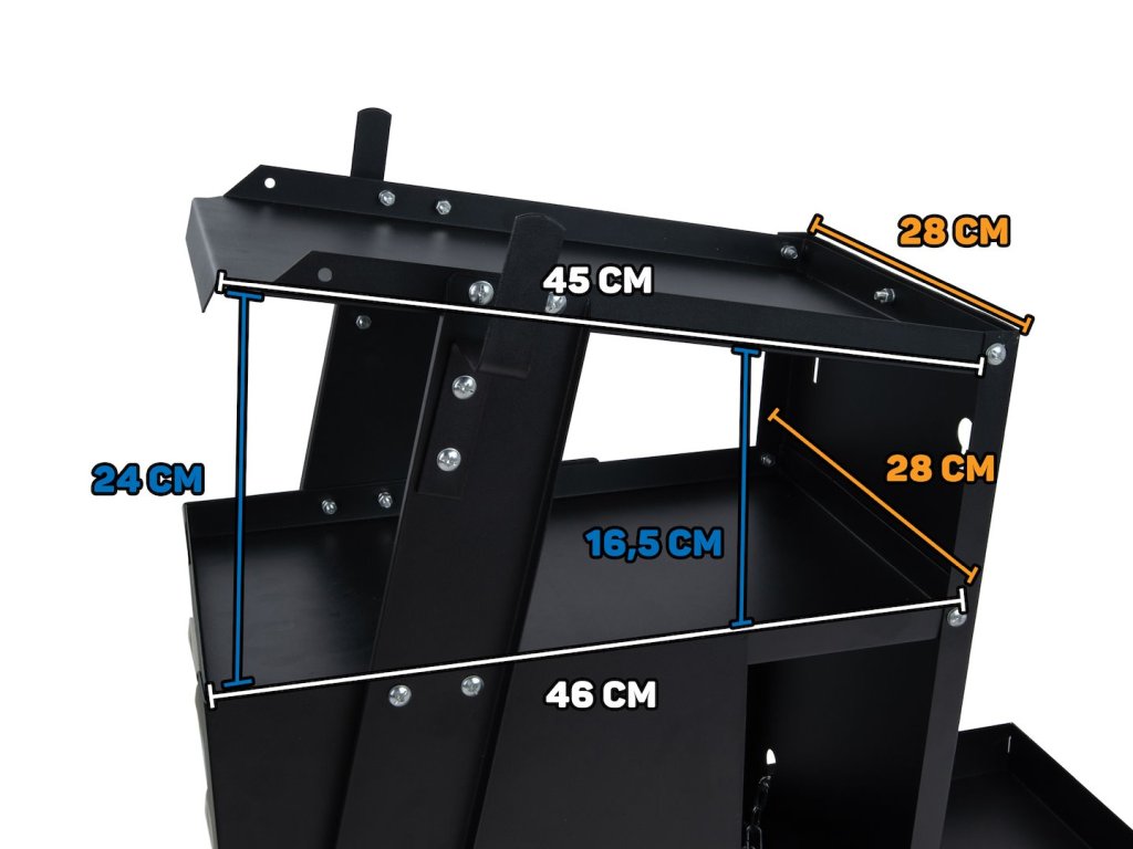 • Robustní ocelová konstrukce: Práškové lakování zajišťuje odolnost proti korozi a mechanickému poškození.