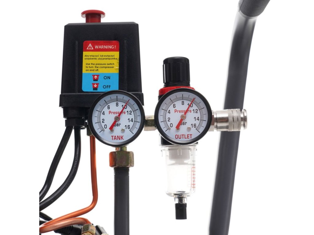 - ergonomický - má redukční ventil vybavený inovativním seřizovacím mechanismem, 2 velké manometry umístěné na kompresoru v poloze usnadňující vyčtení parametrů a pohodlný vypouštěcí kohoutek