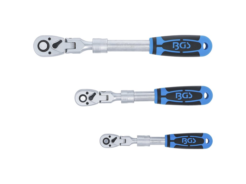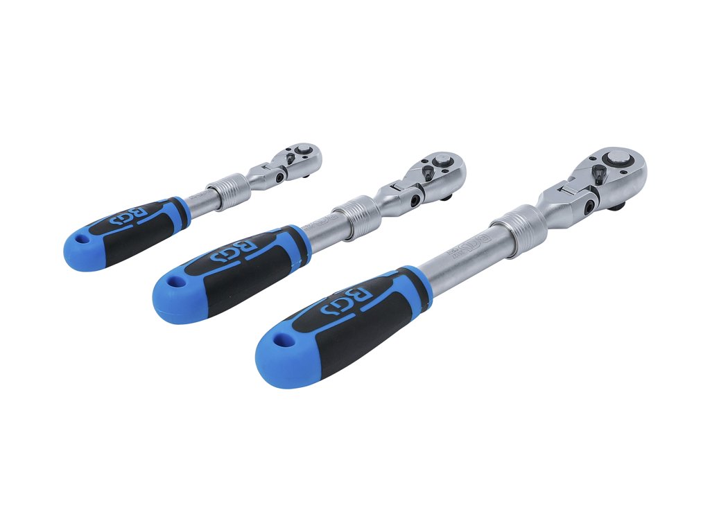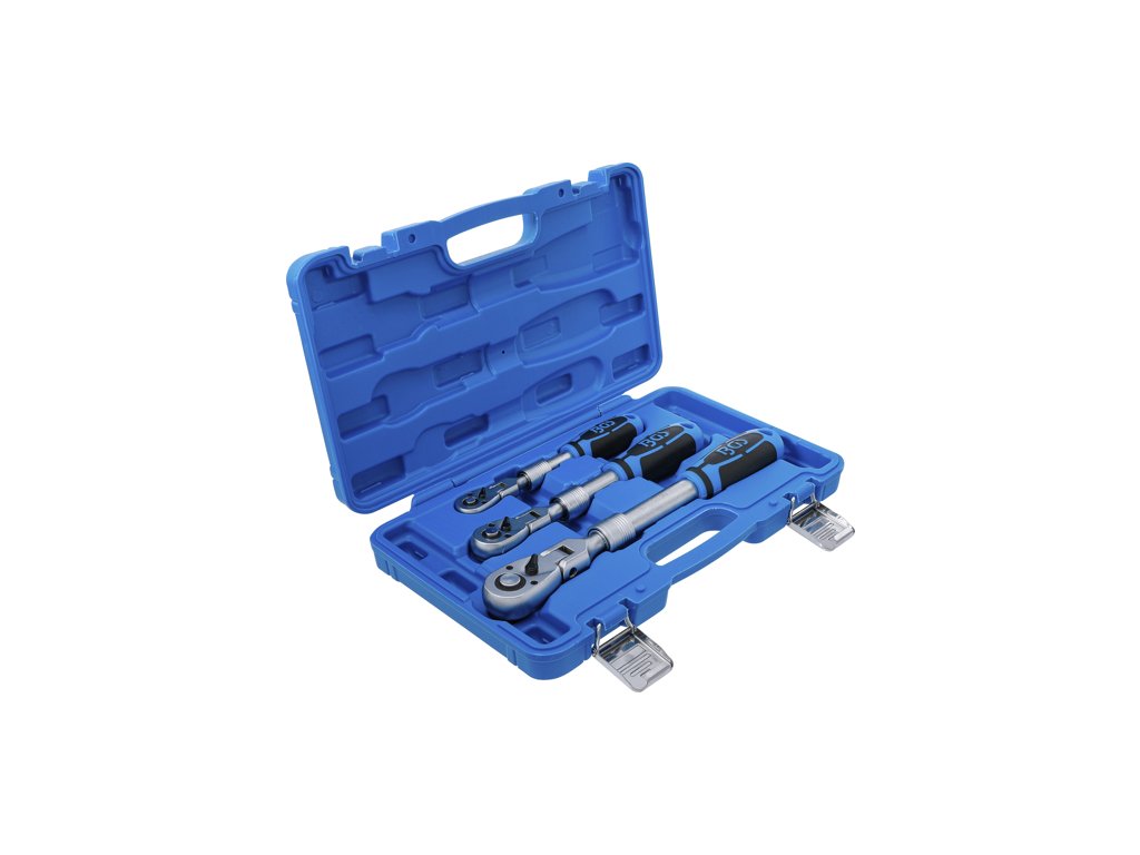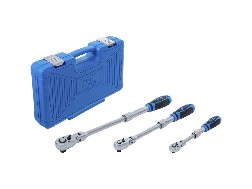 Ráčny s teleskopickou – výsuvnou kloubovou konstrukcí, vodicí 4hrany 1/4", 3/8" a 1/2", přepínání vlevo-vpravo pomocí páčky, mechanismus 72 zubů, sada 3 kusy v plastovém kufříku – BGS Technic 25128