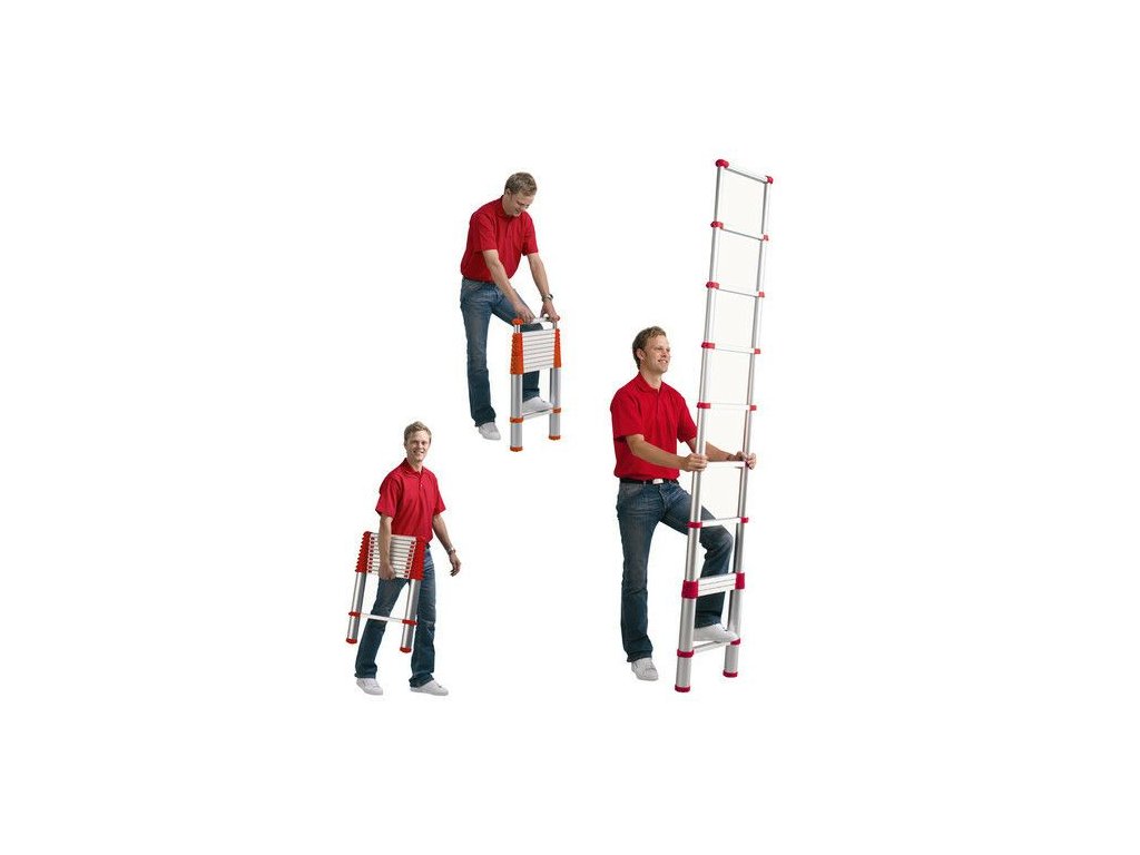 Velmi praktický teleskopický (vysouvací) žebřík s univerzálním využitím v dílně, servisu, domácnosti, na zahradě a mnohých dalších místech. Ve složeném stavu měří pouze 0,74 m, díky čemuž se velmi snadno skladuje nebo převáží autem. Hliníková konstrukce je velmi lehká, všechny prvky, stupnice a pojistné zámky jsou provedeny podle ergonomických zásad a podporují tak jeho snadné a intuitivní používání.