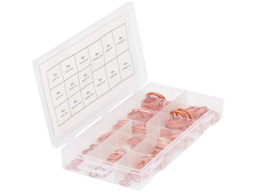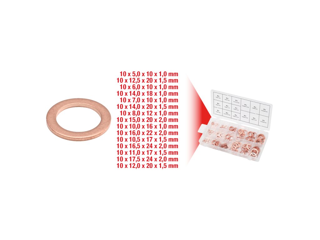 Měděné těsnění (podložky) univerzální, průměry 5 až 17,5 mm, sada 150 kusů v plastové krabičce – KS TOOLS 970.0040