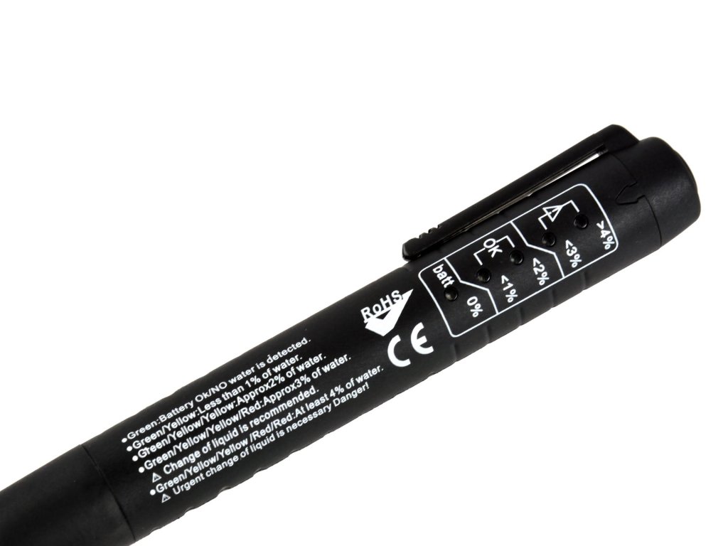 Speciální tester je určena pro rychlé a snadné zjištění stavu náplně brzdového systému změřením procentuálního obsahu vody. Kvalitu tekutiny ukazují barevné LED diody na přístroji.