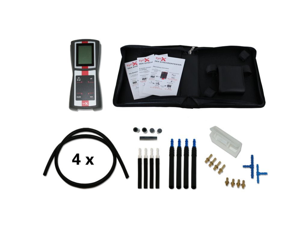 Přístroj na kontrolu synchronizace karburátorů nebo vstřikování paliva v motocyklech (tzv. synchrontester), s adaptéry a hadicemi, provoz na baterie, v tašce – synX Classic