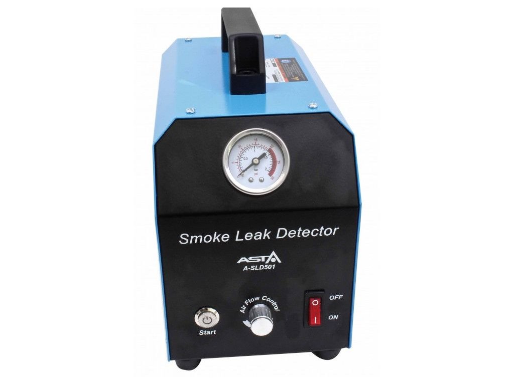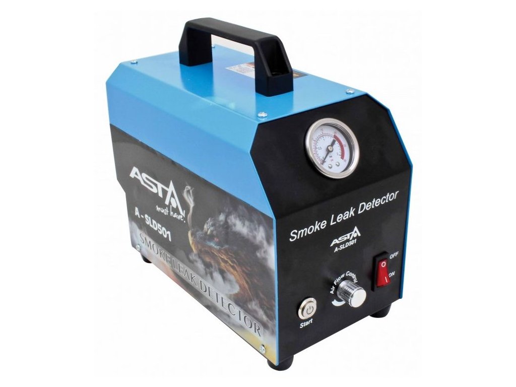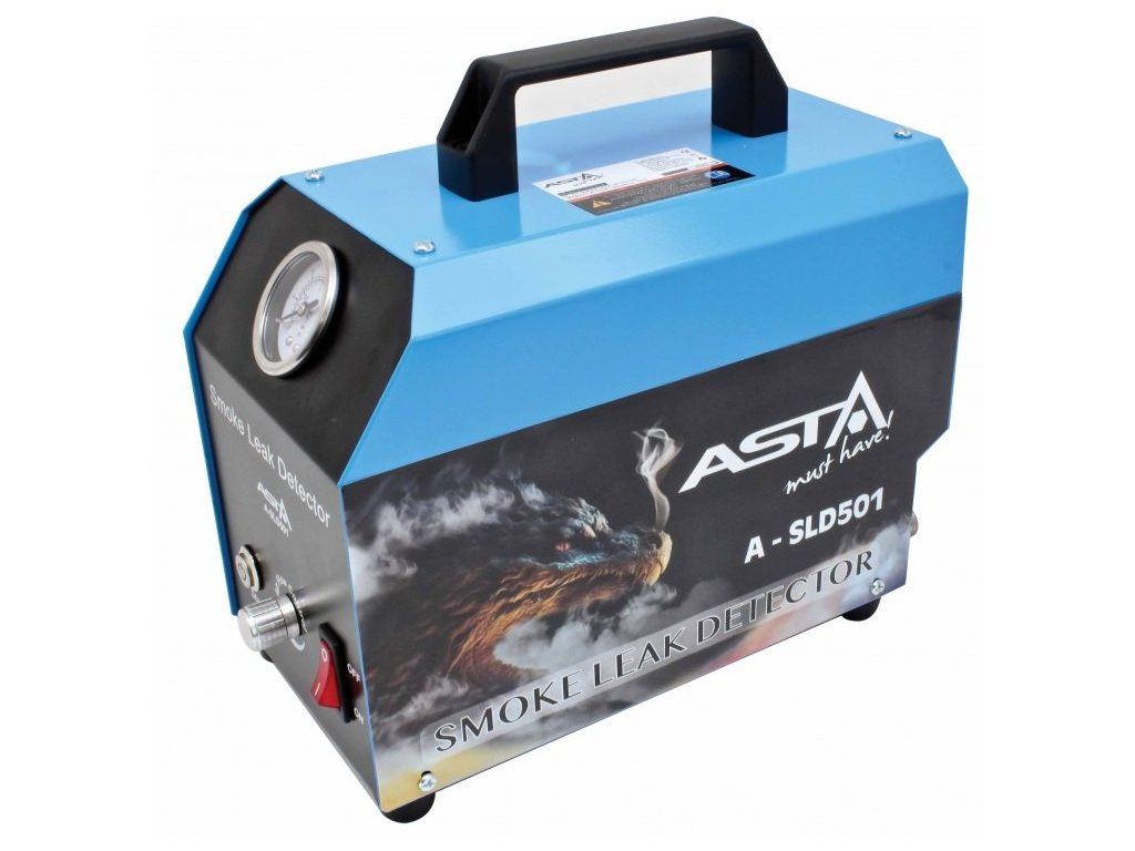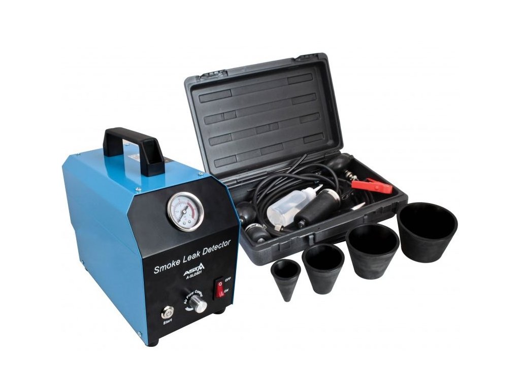 Generátor dýmu pro detekci netěsností. Přípravek na zkoušku těsnosti různých systémů a vedení ve voze pomocí dýmu, generátor kouře, s příslušenstvím v kufříku – ASTA A-SLD501.