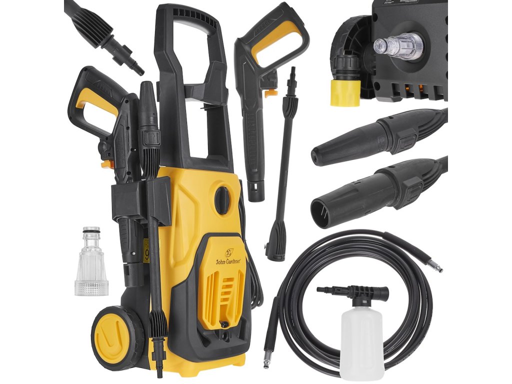 Tlaková myčka 1800 W značky John Gardener je ideálním nástrojem pro vás, ať už chcete umýt auto, chodník/příjezdovou cestu z dlažebních kostek, terasu nebo vyčistit fasádu domu. Elektromotor o výkonu 1800 W spolu s vysoce kvalitní vodní pumpou umožňuje generovat jmenovité tlaky na úrovni 90 barů, maximální pracovní tlak je 130 barů. Výstupní tlak lze snadno zvýšit na impozantní hodnotu 230 barů, stačí použít turbodýzu, která je součástí sady.