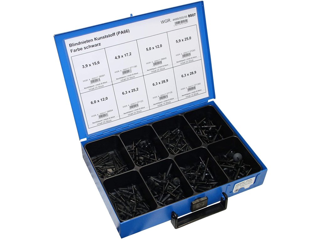 Umělohmotné trhací nýty, různé velikosti, sada 180 v kovovém kufříku – Dresselhaus 44990008507