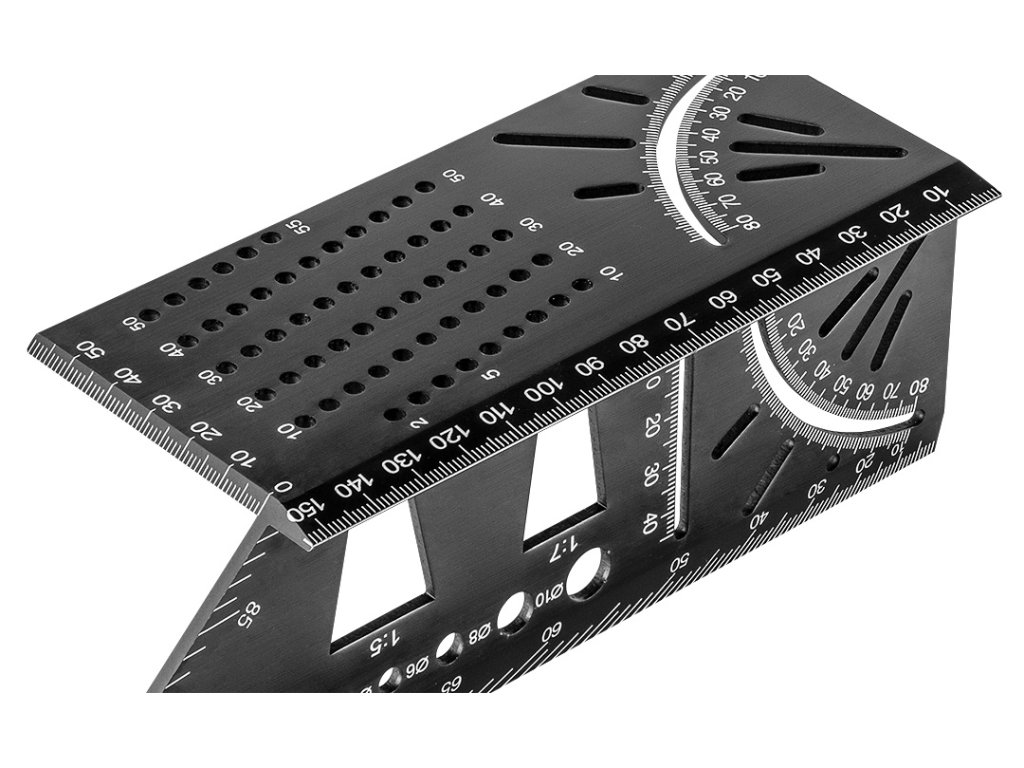 Úhelník umožňuje snadno provádět měření a přenášet je na nosníky, trubky nebo jiné trojrozměrné materiály. Jeho obdélníková geometrie umožňuje provádět přesná měření v rozích. Ideální pro přesné přenášení šikmých úhlů na dvě sousední strany obrobku. Zarážky pro úhel 45° a 90° a úhloměr umožňují provést jakýkoli úkol. 3D úhloměr lze použít jako tesařskou značku pro vytváření rovnoběžných čar a umožňuje také určit průměr vrtáku.