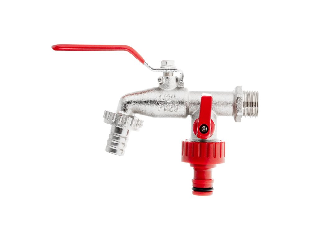 - Dvojitý výstup GZ 3/4" – jeden výstup s rychlospojkou pro zahradní hadice, druhý s 1/2" hadicovým konektorem.