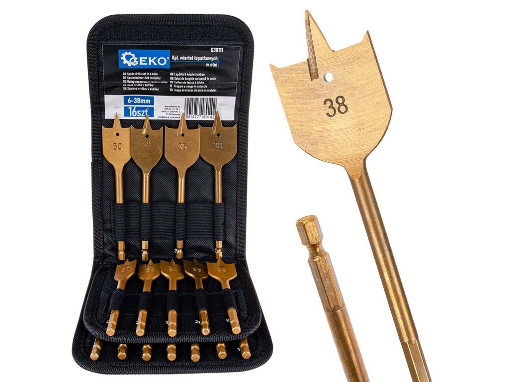 16dílná sada plochých vrtáků – velikosti od 6 mm do 38 mm, délka 15 cm, stopka 1/4" HEX, materiál kalená uhlíková ocel