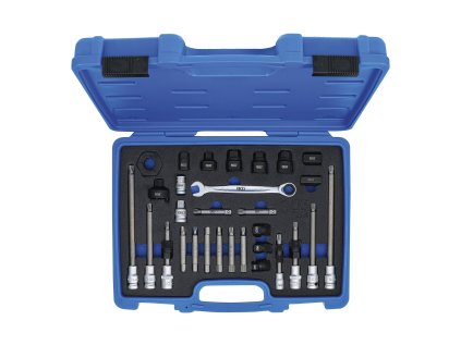 Sada je vhodná pro demontáž řemenic alternátorů. Obsahuje speciální hlavice, klíče a bity. Hlavice pro šrouby se 3 otvory, kříž 28 mm, 3x 4 mm štefty, SW 38. Hlavice pro šrouby...