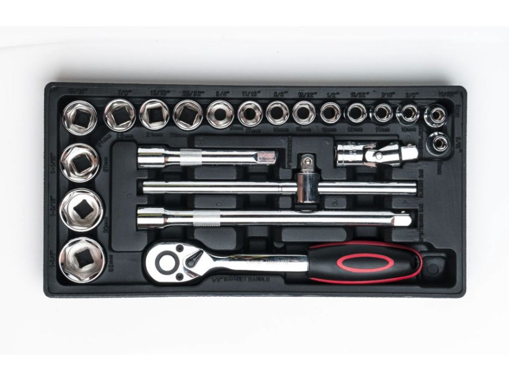 - ráčna 1/2”, prodlužovací nástavec (13 a 25 cm), trhák (25 cm), 8 cm kloub, 1/2” hlavice (8, 9, 10, 11, 12, 13, 15, 16, 17, 19, 20, 21, 22, 24, 27, 30, 32 mm)