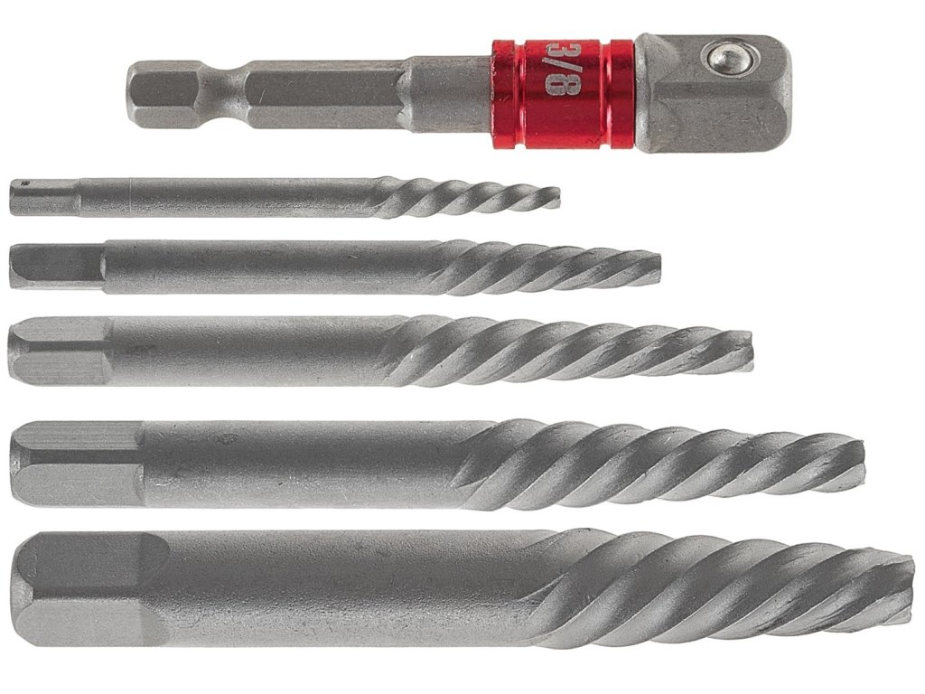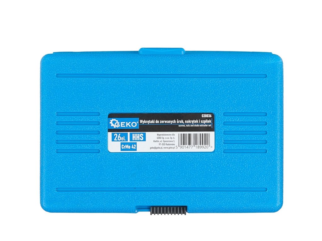 Obsahuje 26 komponentů, včetně nástavců, vrtáků, extraktorů, adaptéru a štípačů matic.