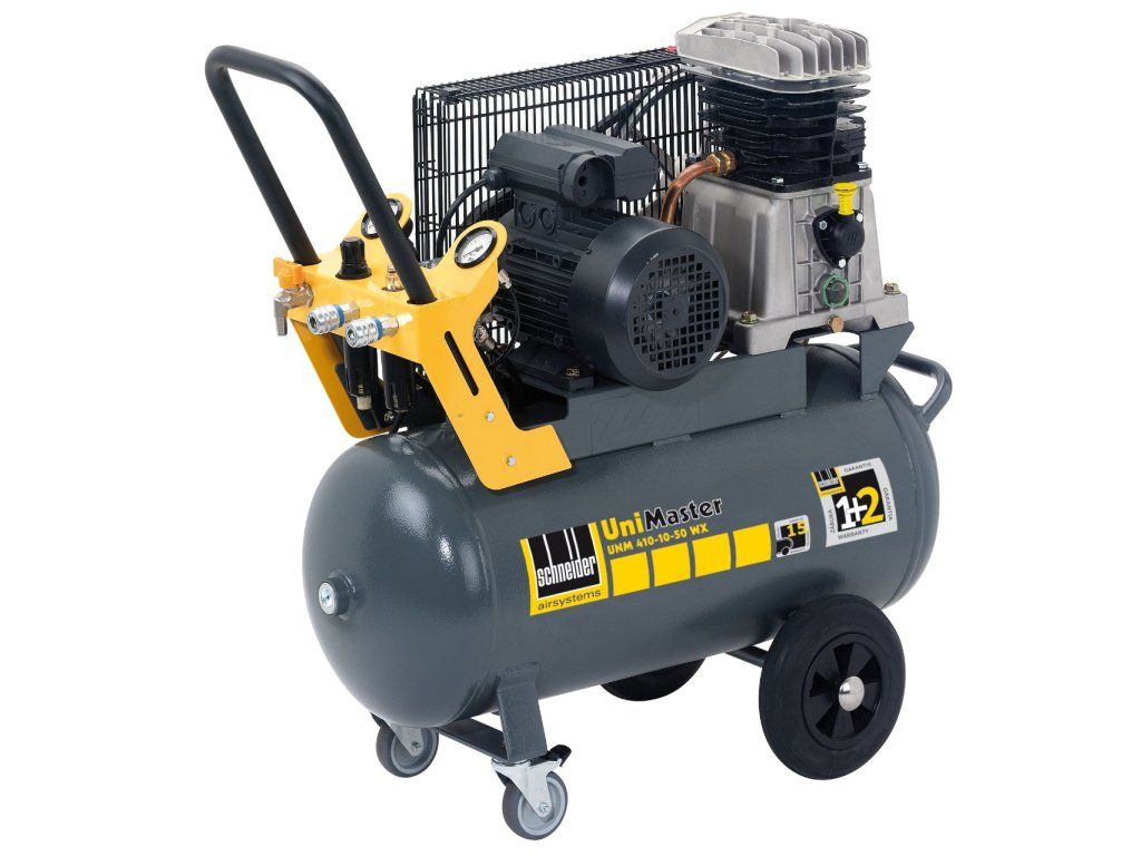 Pojízdný vzduchový kompresor, ležatý vzdušník 50 litrů, elektrické napájení 230 V – Schneider UNM 410-10-50 W