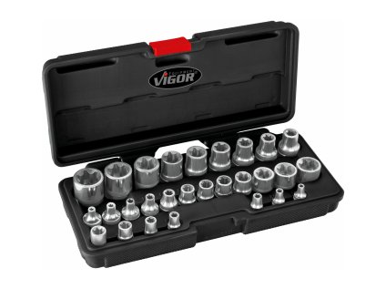 28-dílná sada nástrčných hlavic 1/4"/3/8"/1/2" VIGOR V2687 vysoké kvality (dceřiná firma HAZET/Německo) v plastovém kufříku obsahuje tyto hlavice:1/4" - E 4 / E 5 / E 6 / E 7 /...