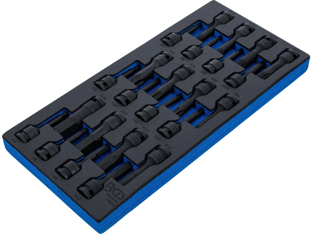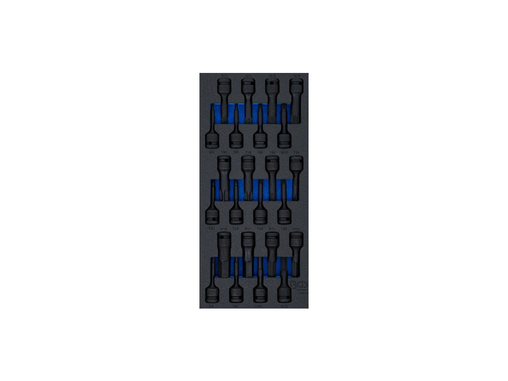 Úderové zástrčné hlavice pro rázové utahováky, vodicí 4hran 1/2“, profily Imbus (HEX), TORX a XZN (tisícihran), sada 24 dílů v pěnové vložce - BGS technic 74514