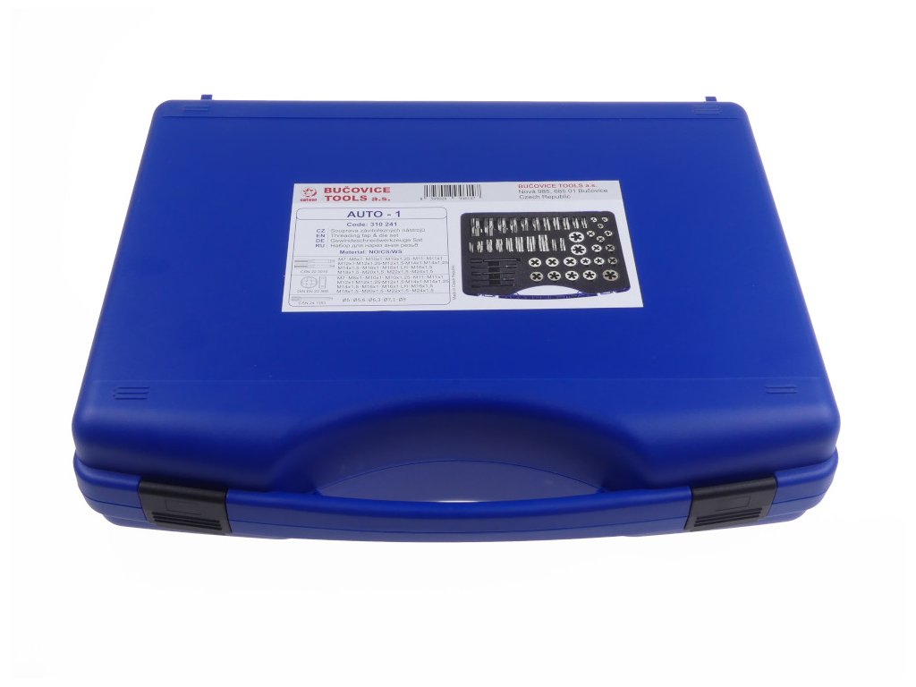 Sada závitníků a závitových oček (kruhových závitových čelistí) s nástavci, pro pravotočivé závity, 43 dílů v kovovém kufříku – Bučovice Tools 310 241 (AUTO-1).