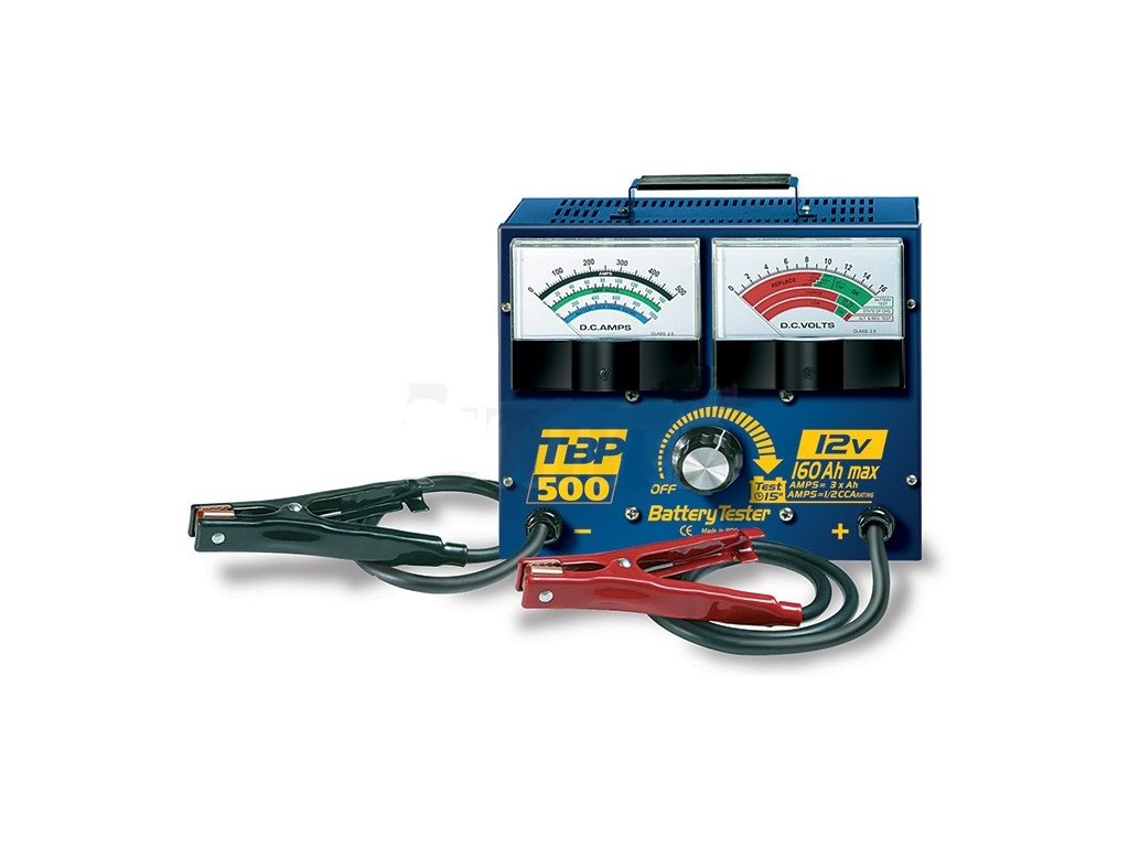 testovací napětí 12,0 V, max.zatěžovací proud 0-500 A, rozměry 105x60x255 mm, hmotnost 3,5 kg, zkušební kabely 1 m.