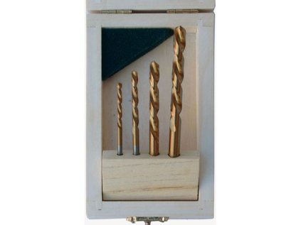 Spirálové levotočivé HSS vrtáky s válcovou stopkou a TiN povrchem. Sada 5 dílů Pro odvrtávání zlomených vrtáků, šroubů, atd. Sada 4 ks v dřevěné kazetě