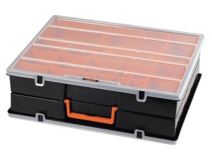 Kufr – organizér 42x35x7 cm, 22 vyjímatelných přihrádek, průhledné víko, umělohmotný, černo-oranžová barva – TOOD TO722 Ideální na uložení a přenášení drobností pro autoservis,...