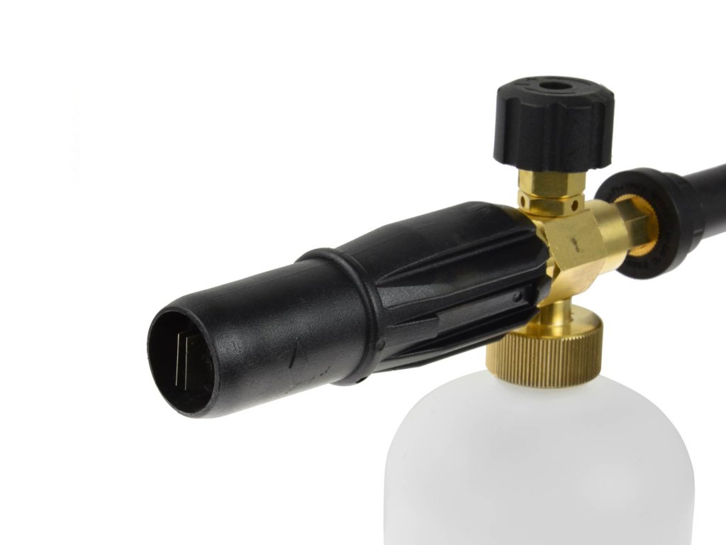 Praktický pomocník pro mytí všeho druhu pomocí vysokotlaké myčky. S bajonetem pro myčky značky Karcher série „K“. Tělo trysky je vyrobené z mosazi, která je odolná i agresivním mycím prostředkům. Zpěňovací tryska je vybavena regulací, díky které si nastavíte regulaci proudu a množství podávané chemie. Čistící nádoba o objemu 1 litr bohatě vystačí pro umytí celého auta.